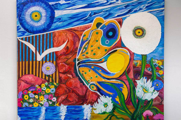 Using the desert landscapes and seasides of Southern and Baja California as their fertile ground, his surrealistic scenes are populated with lush flora that take on an anthropomorphic quality. Butterflies, flowers, ocotillos, and desert mountains become proxies for the people navigating the desert, visualizing the narratives of migration without drawing on essentialist tropes. For the artist, his works are as much autobiographical as they are collective stories that document moments of struggle and celebration that would otherwise be lost to time.