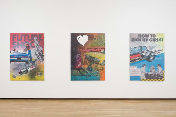 In pieces that function as both homage and critique, White collapses signs of racing and car culture with references to 20th-century American painting. Multiple-canvas works such as Posi Track and Burnout (both 2019) take cues from James Rosenquist’s famous Vietnam War-era painting F-111 (1964–65). In White’s versions, images of mangled engines, worn tire treads, and damaged landscapes suggest a trampling of both philosophical ideals and the natural environment. In addition, the works make reference to Andy Warhol’s Death and Disasters series and Jackson Pollock’s drip paintings. The exhibition also includes new works from the artist’s ongoing Jeans series. These pieces make use of worn denim, a quintessentially American fabric associated with labor and a sense of rugged individualism. Co-opting the material and its cultural connotations as a substrate for painting, White makes marks with dripped and splattered bleach before garnishing each piece with flat cut-out rainbows, beer bottles, and energy drinks. A site-specific installation complete with wood paneled walls, carpet, and one of White’s signature denim sofas creates a quasi-automotive shop backdrop for a new suite of unique pigment prints. Carving directly into the paneling, White references the DIY aesthetic of the 70s muscle car era by way of hand-drawn symbols, slogans and logos. Taken together, the works in Racetrack Playa riff on the visual cues of car culture, the resilient materiality of denim, and the sexiness of commercial graphics to examine a society long drawn to speed and dominance. Reexamining this typically male-dominated arena, White pushes back on advertising’s false promise that perhaps all of your desires are for the taking, if you just smoke the right cigarettes and drive the right car.