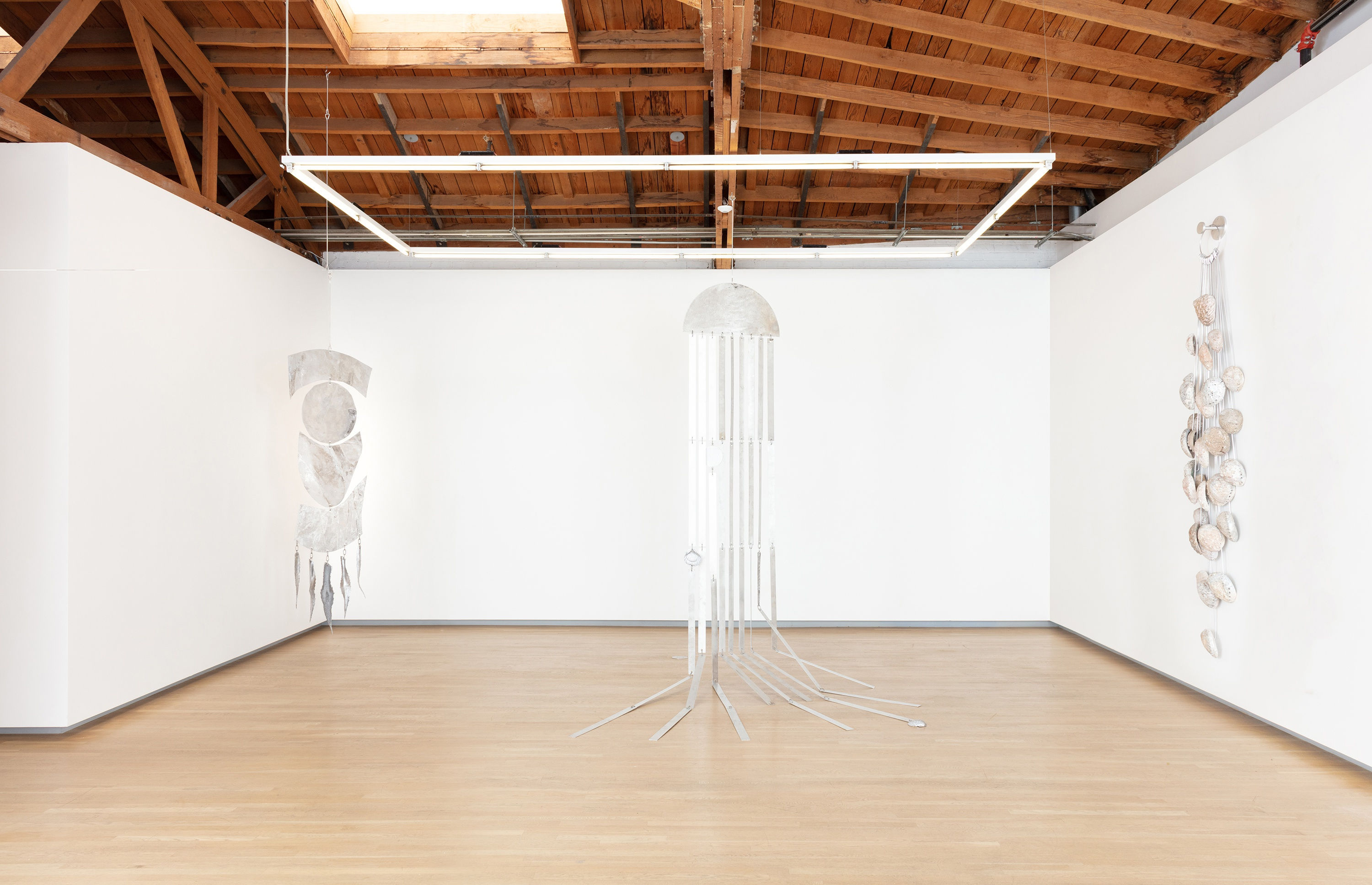 Ray has built large aluminum metal mobiles with some hanging freely in the gallery and others hung against the wall. She mixes in objects such as abalone, driftwood, seashells, and corn. Each item relates to a specific childhood memory or aspect of her family history. For example, there is a large piece that uses abalone shells, and Ray remembers how her father used to make abalone in the backyard, and she would eat it with lime and salt.