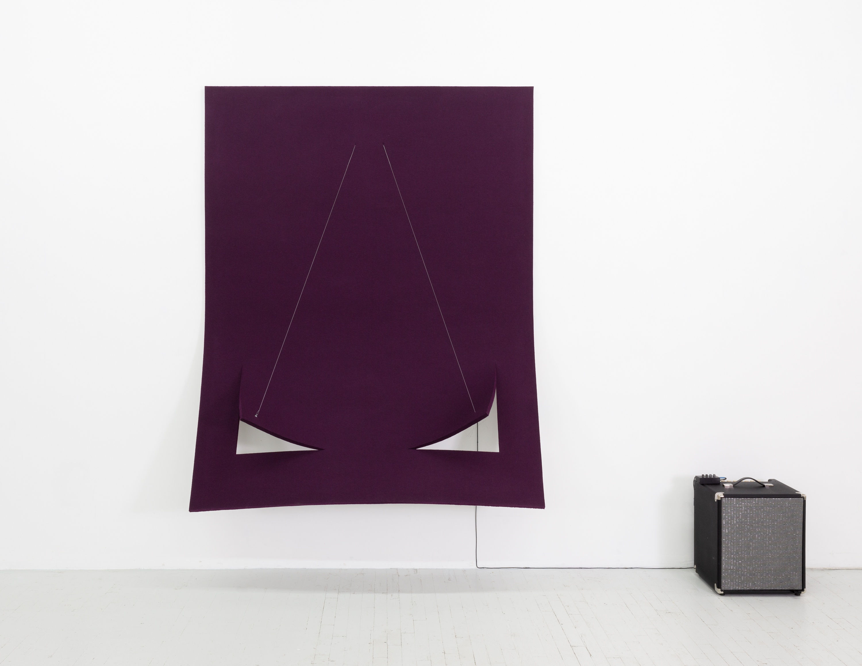 Naama Tsabar, Work on Felt (Variation 29) Purple, 2021. Carbon fiber, epoxy, wood, felt, microphone, guitar amplifier. 80 3/4 x 66 1/2 x 21 3/4 inches. Courtesy of the artist and Shulamit Nazarian, Los Angeles.