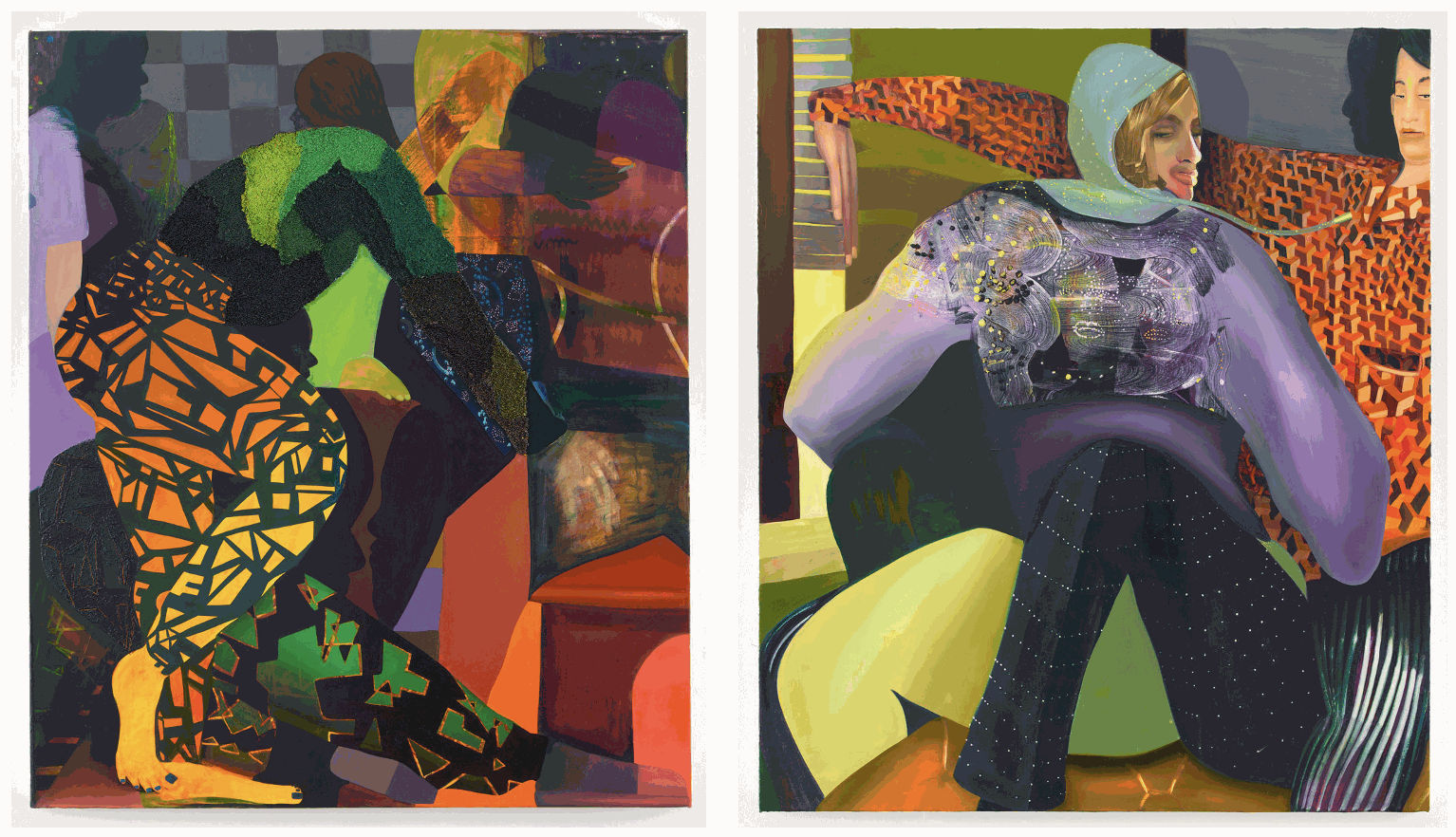 To make something new you must thoroughly understand the past — that way, you can sense when you are pushing into virgin territory. Just 27 years old, Coady Brown has surveyed the landscape of painting and wandered into a disco the German expressionist Ernst Ludwig Kirchner never visited, although the well-dressed swells in his early-twentieth-century street scenes of Berlin were surely heading that way. On their journey to the now, they might have passed Otto Dix’s 1926 portrait of the journalist Sylvia von Harden, in checkered dress with monocle, cocktail, and cigarette, or Max Beckman’s patterned bathers and geometric waves in 1924’s Lido.