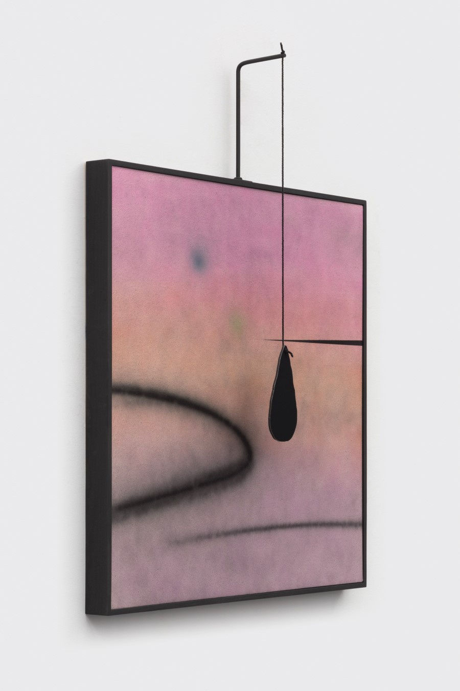 Two square paintings in her exhibition embody this idea. In Dripping Green (After Calder) and Dripping Pink (After Calder), White places a hook-shaped metal armature atop a framed painting. On it, a black shape hangs into the space a few inches from the painting’s surface. The work charts new territory for her and also reflects a juxtaposition she likes: “It’s always about something hard and something soft, something atmospheric and something graphic. What happens when those two things meet and share space?”