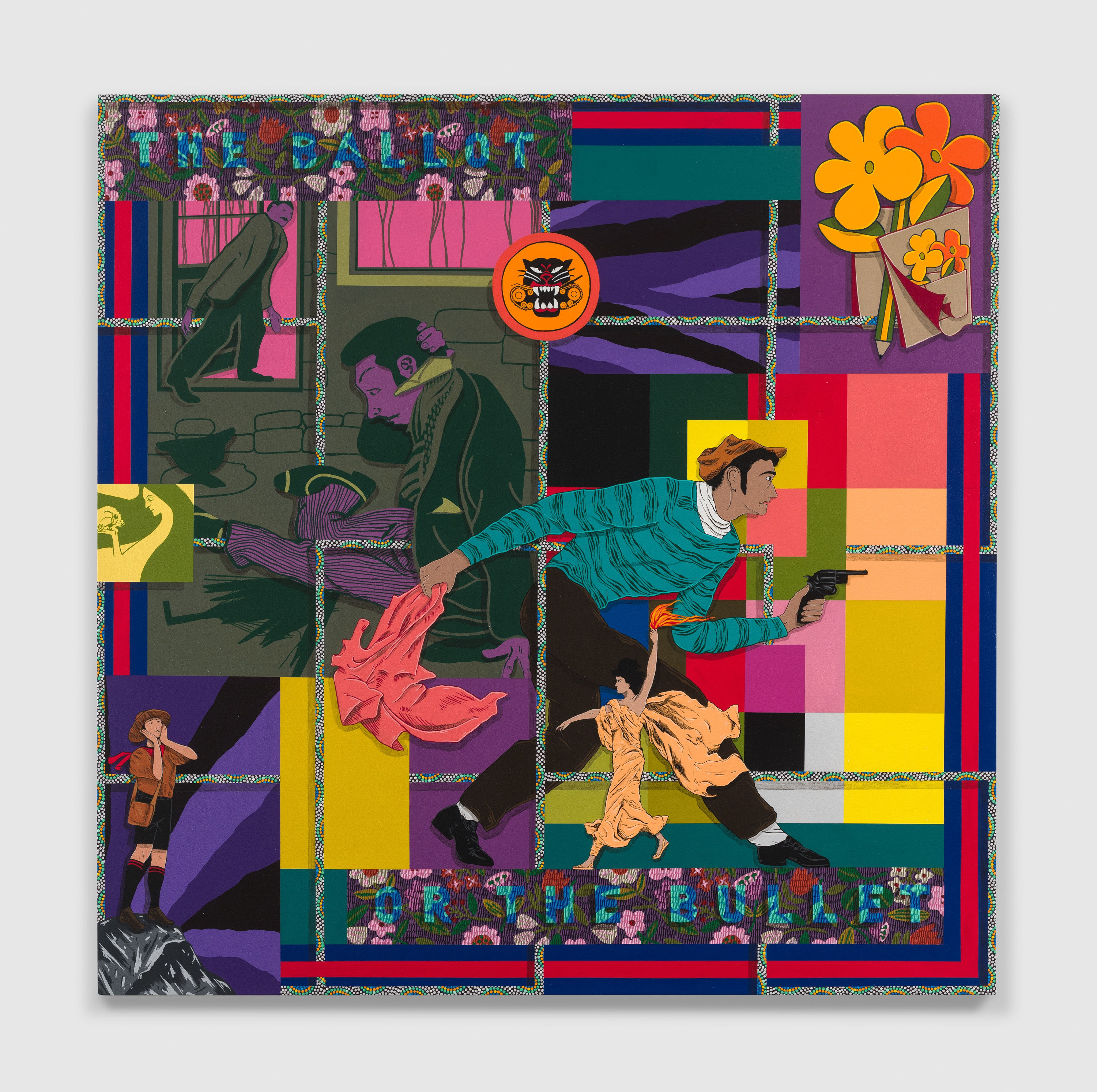 Amir H. Fallah, "The Ballot or the Bullet," 2022, 60 x 60 in., acrylic on canvas; photo by Ed Mumford, courtesy of the artist and Shulamit Nazarian, Los Angeles.