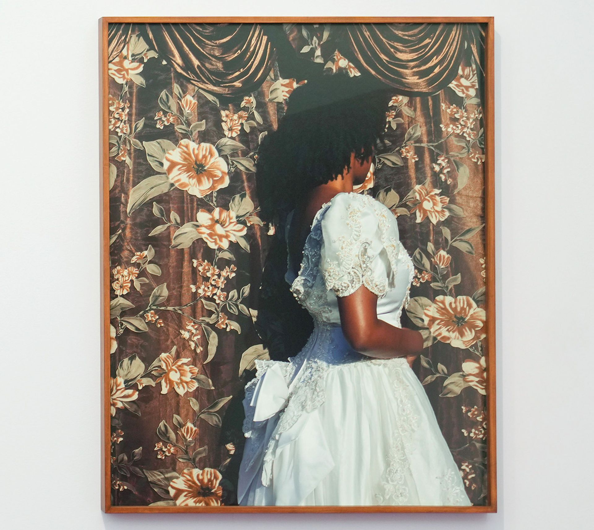 The photographer Widline Cadet, who was born in Haiti and is based in Los Angeles, presents a series of works that reinterpret her family’s archive. In this image, she depicts her mother’s wedding dress—the wearer turned away—highlighting a sense of “protection and care” from the gaze of the viewer. “The way that Los Angeles becomes blurred with Haiti in this work is really interesting when thinking about diaspora,” Harden says. “We don’t really think about the two places being connected, but here, Los Angeles looks like home and feels like home.”