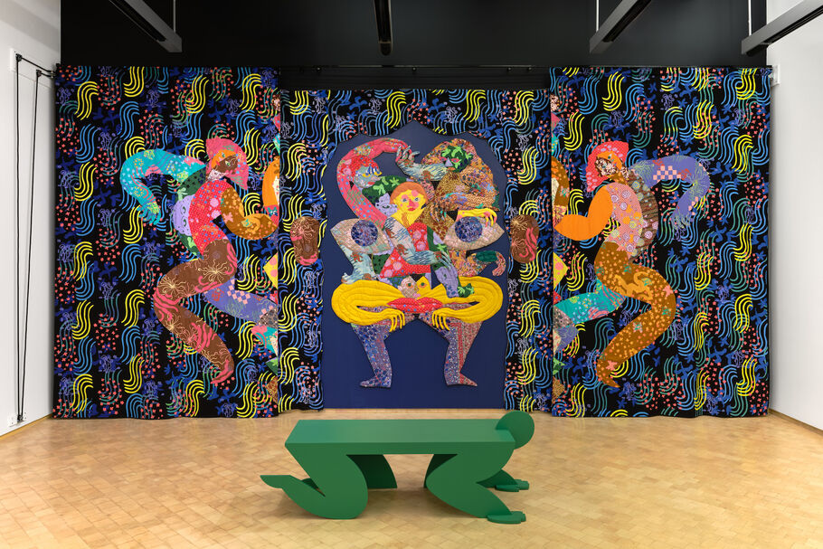 While coming from different backgrounds, the artists explore similar themes, including the complexities of identity and the fluidity of cultural exchange in a world defined by globalization, displacement, and migration. The works on view span a range of disciplines, from mixed-media paintings and sculptures to immersive presentations, like Widline Cadet’s striking photographic portraits that consider the hybrid, fractured nature of identity inherent in diaspora. The materials in the show are equally diverse. In particular, several artists use nontraditional components, like the air fresheners Chaveli Sifre incorporated in the neon sign Perpetual Renewal (2024)—one of 10 works specifically commissioned for the triennial. Emitting scents of coconut and pineapple through the gallery space, the air fresheners, which viewers can take home, create an atmosphere reminiscent of a tropical island.