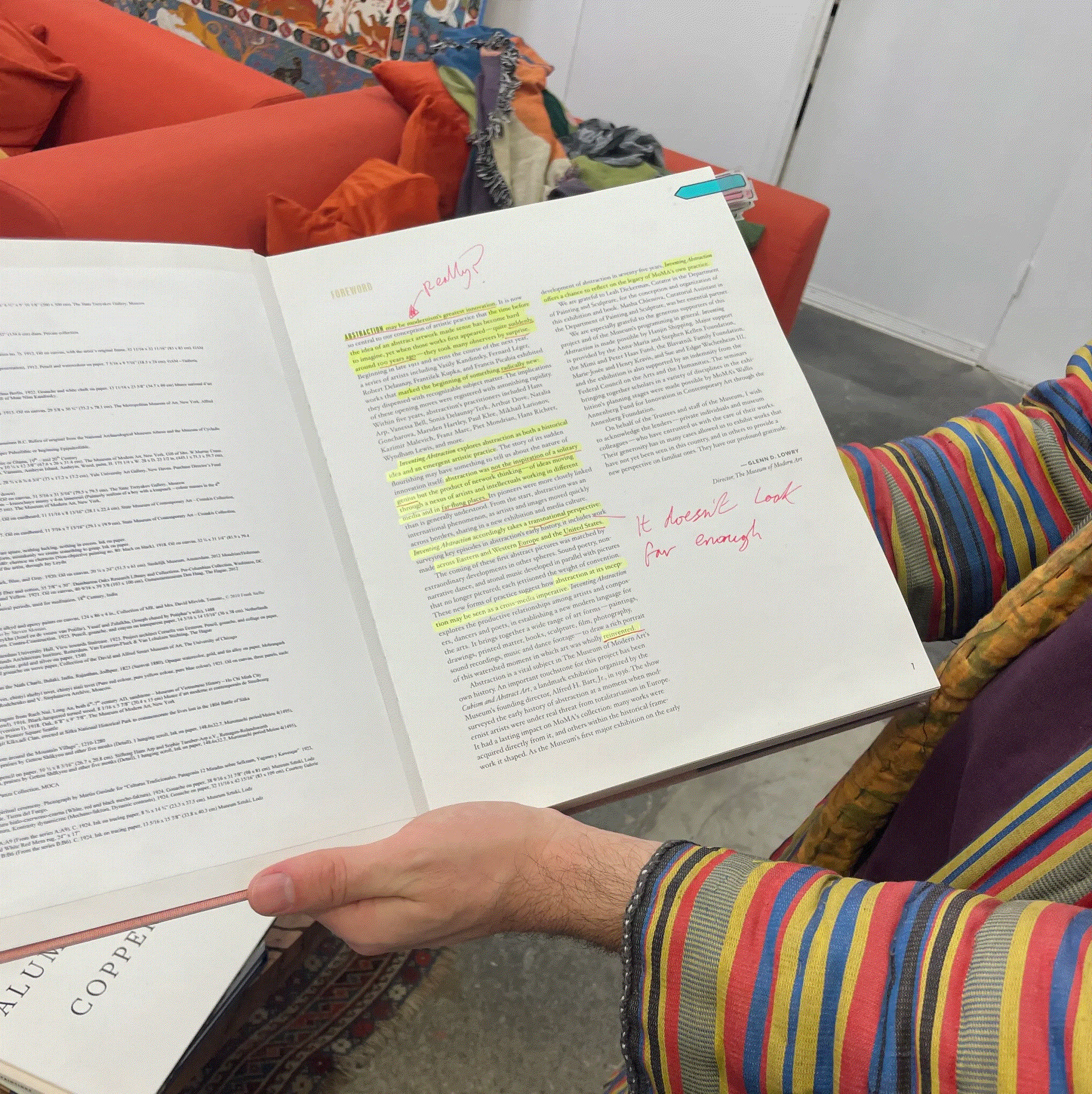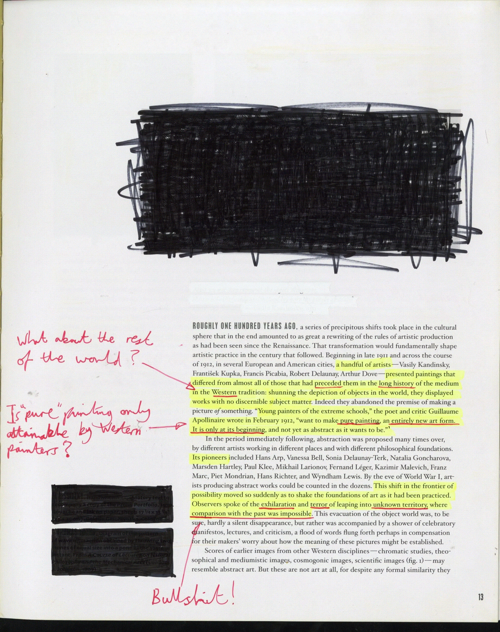 The zine’s title puts a spin on the Museum of Modern Art’s (MoMA) 2012–13 exhibition Inventing Abstraction, 1910-1925, which claimed the titular decade and a half as comprising the early history of abstraction and designated the genre as an invention of the West. For his zine, Pour annotated the MoMA exhibition catalog’s essays with a yellow highlighter and a red-ink pen, correcting the authors’ short-sighted understanding of abstraction. Former MoMA Director Glenn Lowry’s foreword for the catalog argued that “abstraction may be modernism’s greatest innovation” with its “radically new” works first appearing “quite suddenly” only a century ago. Pour responded to Lowry’s claims in the margins of the text with a simple question: “Really?”