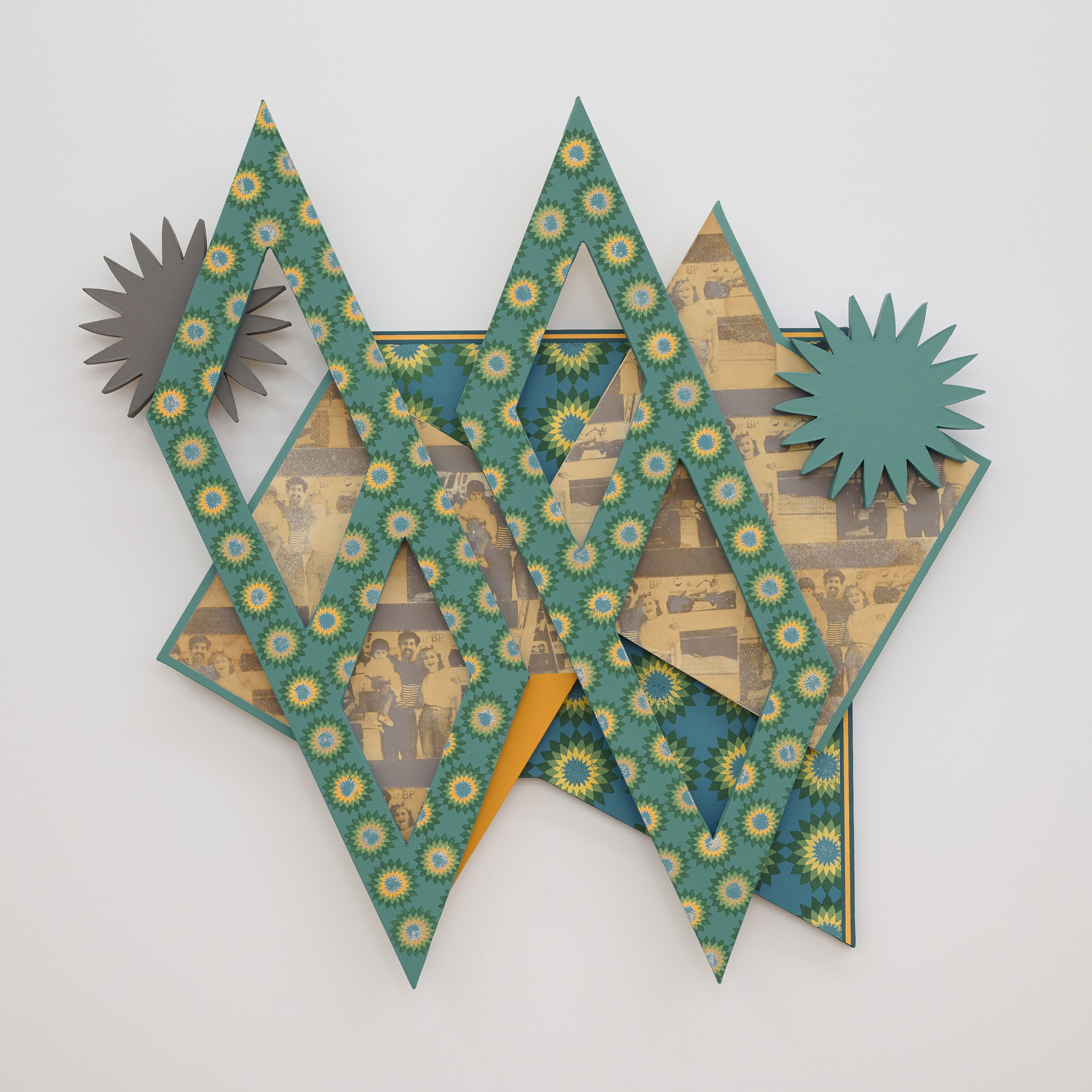In “For Your Eyes Only” (2024), for instance, Pour included redacted CIA documents from the US-backed coup of Iranian Prime Minister Mohammad Mosaddegh in 1953. In “She Fell In Love With A Foreigner (BP)” (2024), he screenprinted a photograph of himself and his parents descending from an airplane after landing in Los Angeles for his uncle’s wedding in 1989. Behind them is the logo for BP or British Petroleum, formerly known as the Anglo-Persian Oil Company. “I didn’t realize the BP logo in the background until recently,” the artist told me. “It’s the perfect family photo because I am tying my own history to that of Britain and Iran.” When Mossadegh successfully nationalized Iran’s oil in 1951, the British, aided by the US, did everything in their power to derail his plans. Here, Pour repeated the Helios symbol from BP’s logo using acrylic paint and stained the shaped canvas with tea bags from the British PG Tips and Iranian Sadaf brands — a nod to his dual heritage.
