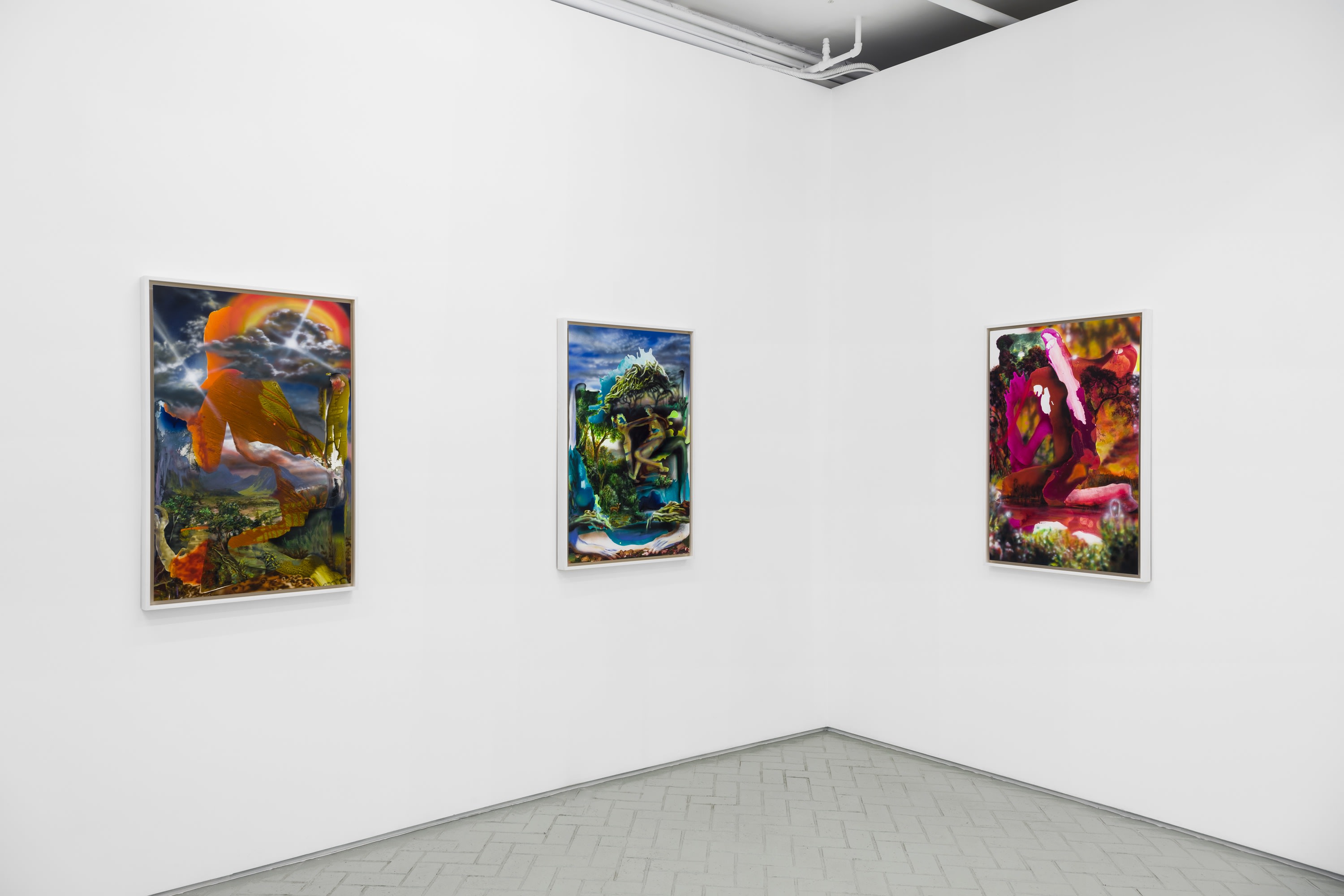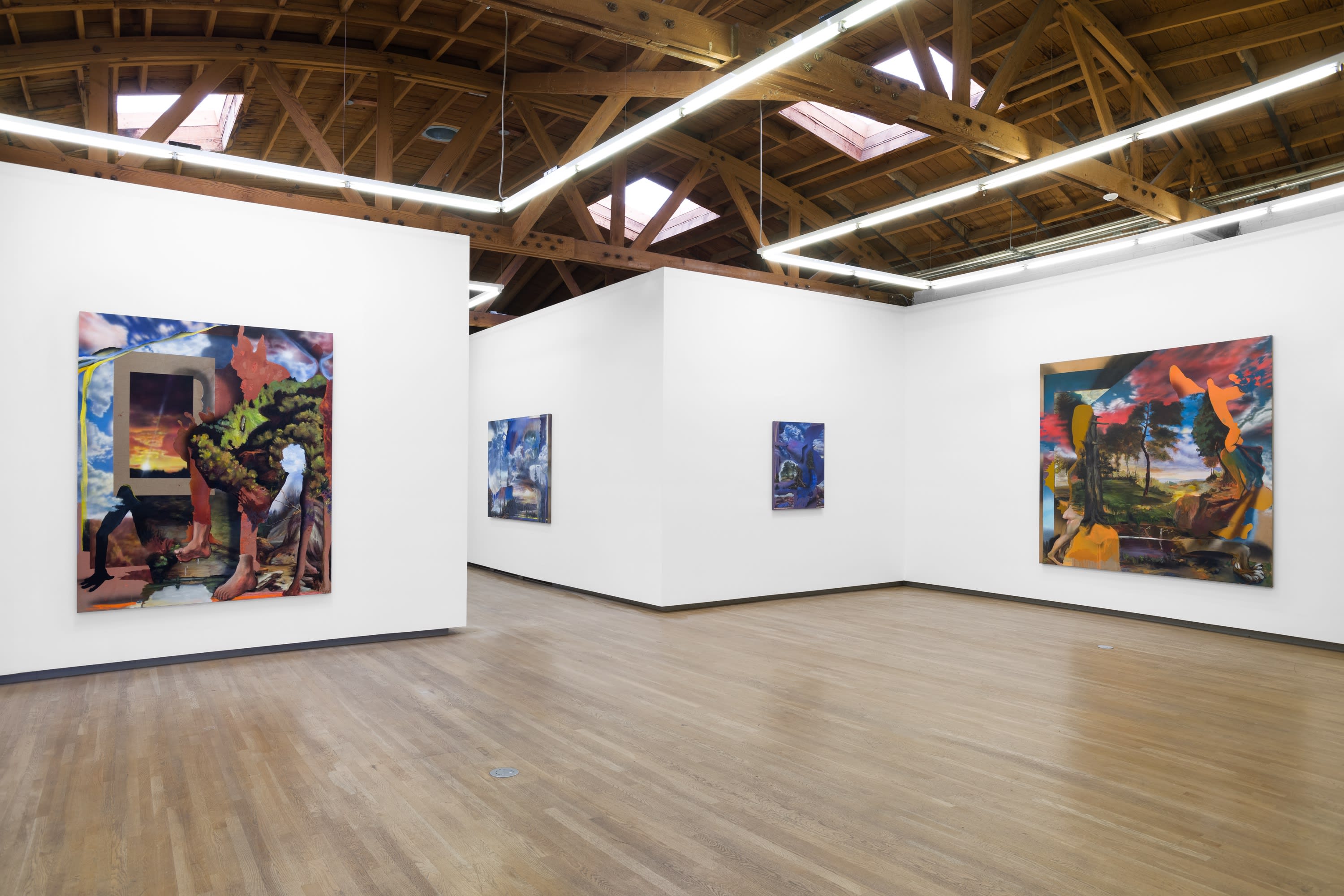 An abstract form will quickly become part of a body or the extension of land. Polychromatic skyscapes—sourced both from the artist’s photo archive and visual media online—are rendered with hyperrealistic detail, while figures are consumed into epic environments that emerge from color fields. These various references coalesce into a fractured yet coherent depiction of our world. Lapin has created an experience akin to our own perception: one that is littered with conflicting information that must logically connect.